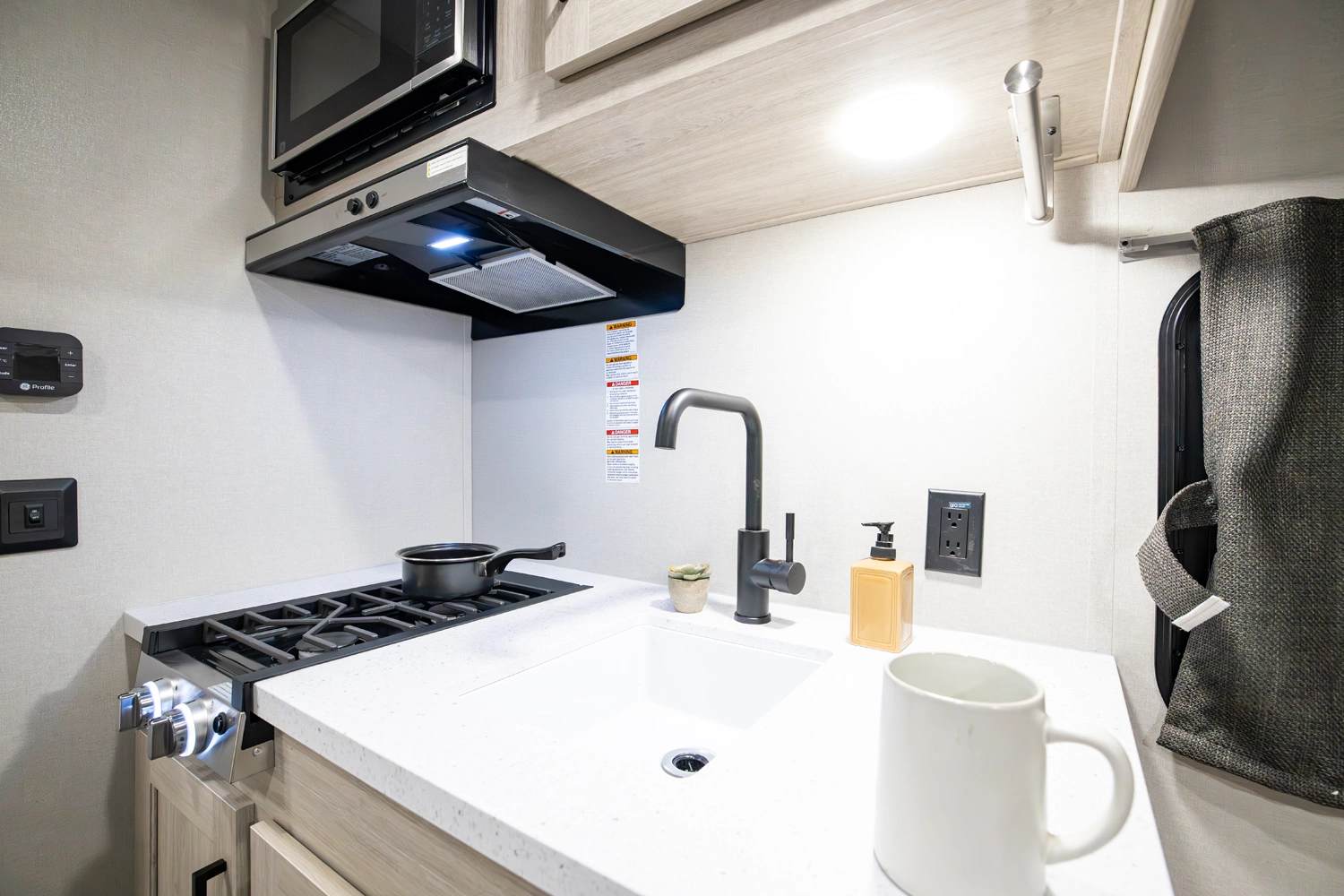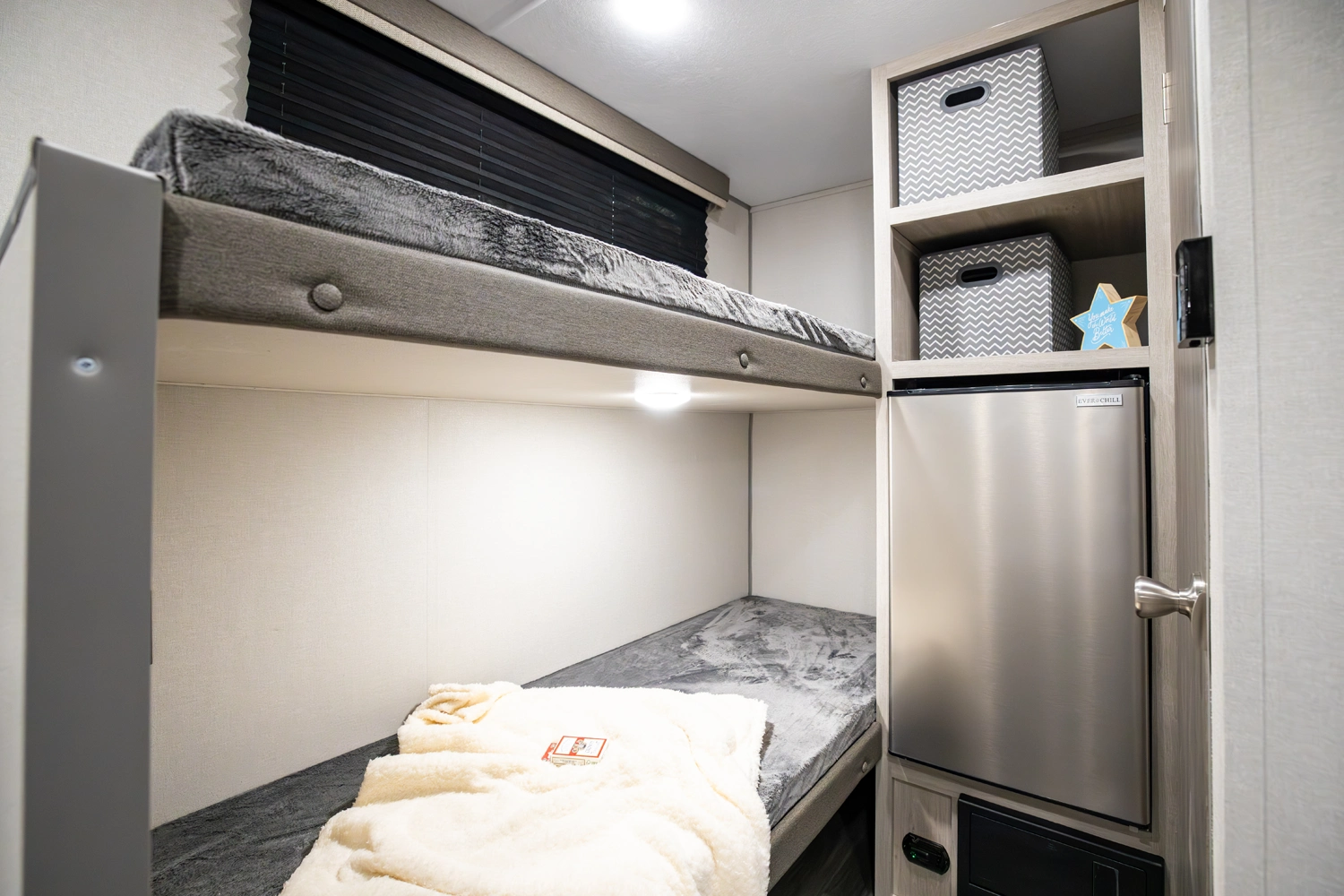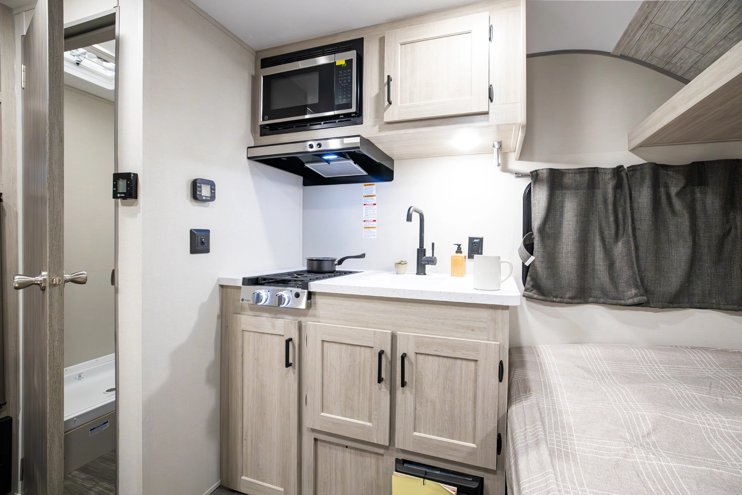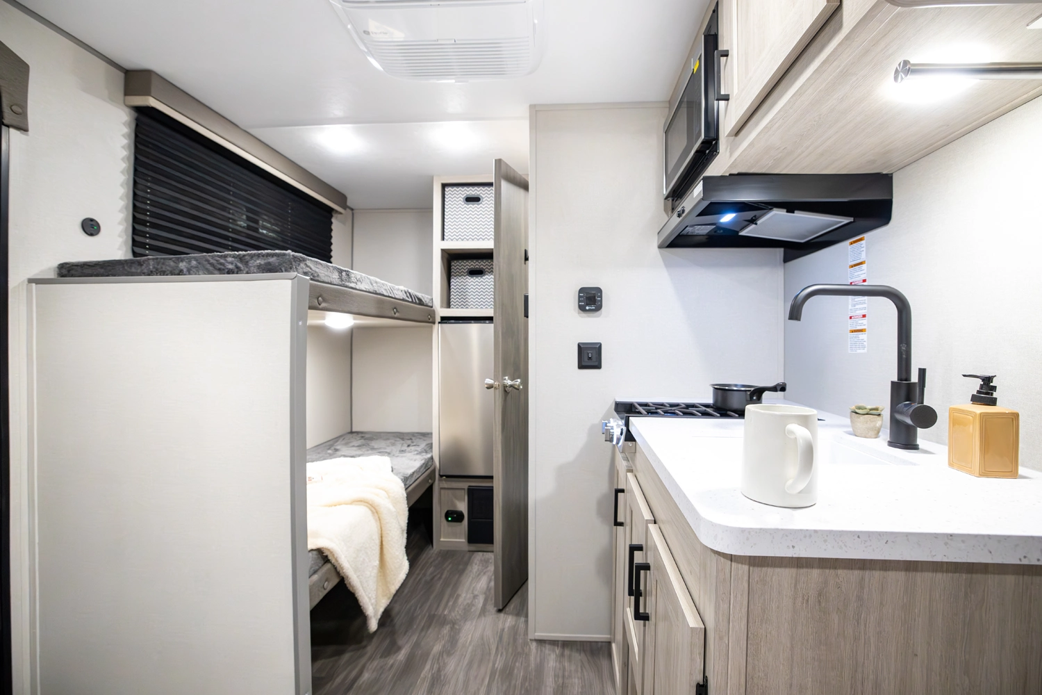 A compact 16' travel trailer that’s easy to tow and perfect for families getting started in the camping lifestyle. Features bunk-style sleeping, a functional kitchen, and essential amenities. Great for quick escapes, weekend trips, and making simple outdoor adventures easy and enjoyable.