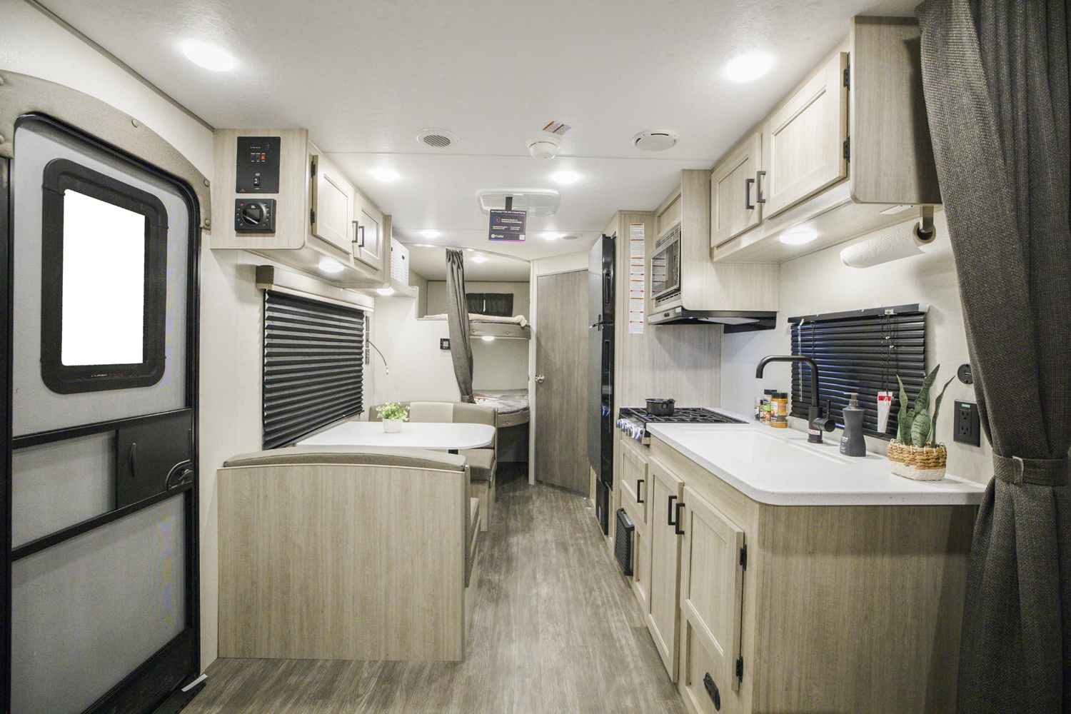 Stretching into mid-size territory, this trailer expands living and sleeping space for small families or groups. Bunk-style sleeping and a functional kitchen give flexibility, making it a dependable choice for weekend retreats or short-term getaways.