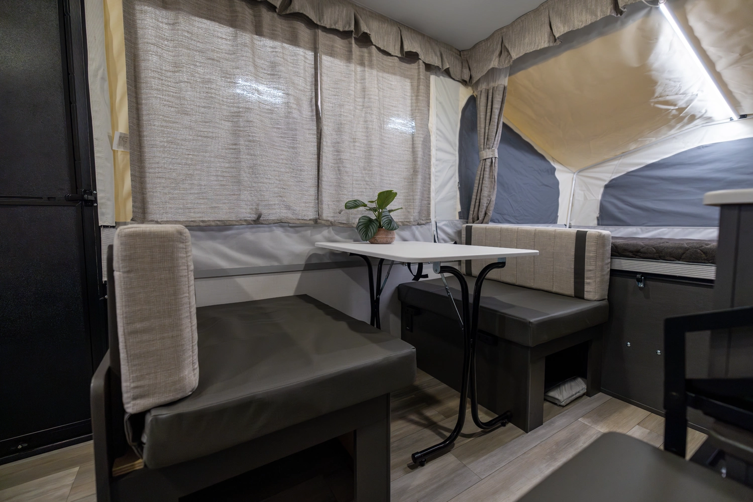 MAXIMIZING YOUR INVESTMENT FOR THE LONG HAUL. Elevate your camping experience with the unmatched quality of the MAC series line, enhanced by a host of additional features. Imagine the comfort of a Create-a-Breeze fan for optimal ventilation, the convenience of a power roof lift, an outdoor grill for culinary adventures, four stabilizer jacks for stability, and the warm embrace of brilliant LED awning lights that gracefully guide you back to your camper as the sun sets. Embrace the luxurious side of camping with your Flagstaff tent camper, where 'roughing it' becomes a thing of the past.
