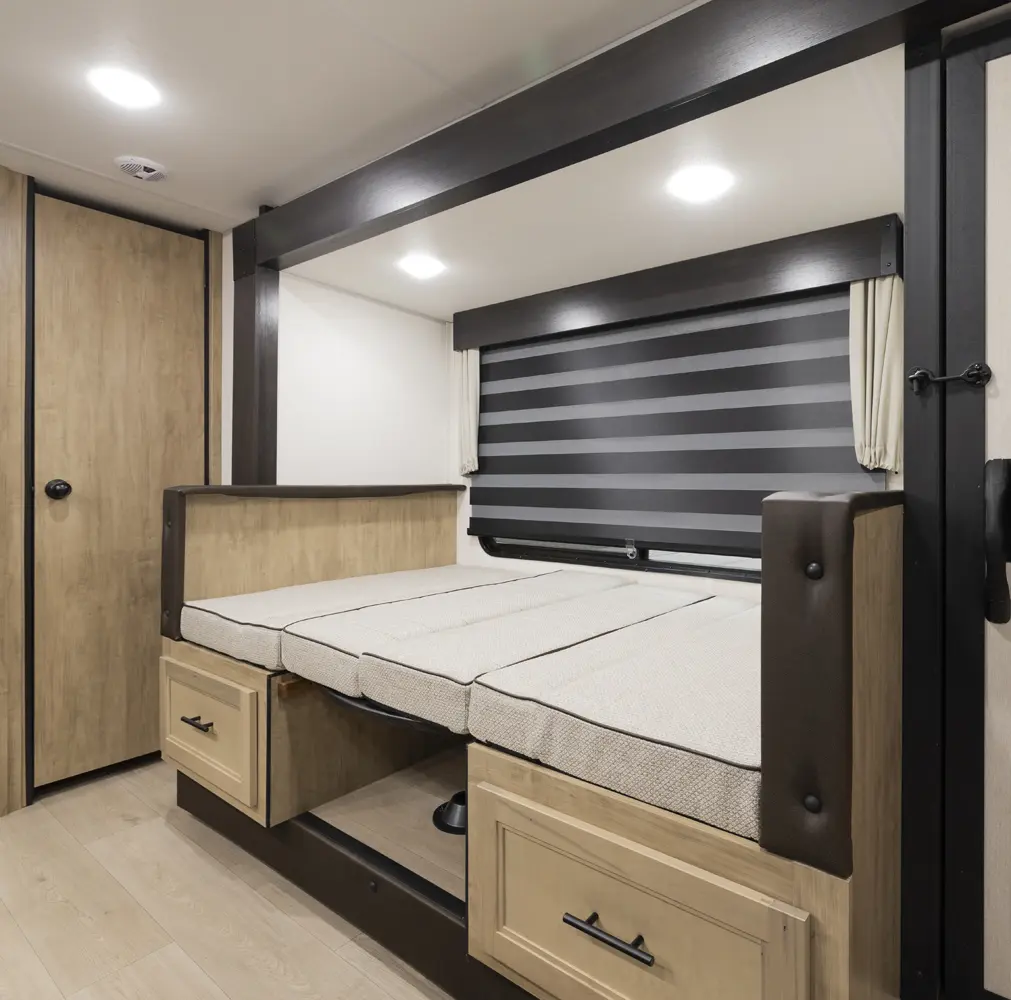 The Cherokee Grey Wolf 26SS by Forest River is a compact yet luxurious travel trailer. Its rear kitchen layout, combined with a large dinette, air fryer combo microwave, 12-volt refrigerator, and ample prep space, makes it perfect for cooking and entertaining. The spacious living area features a convertible sofa for additional sleeping and a hidden pantry for convenient storage. The primary suite, with a king-size bed and ample storage, offers a comfortable and stylish retreat.