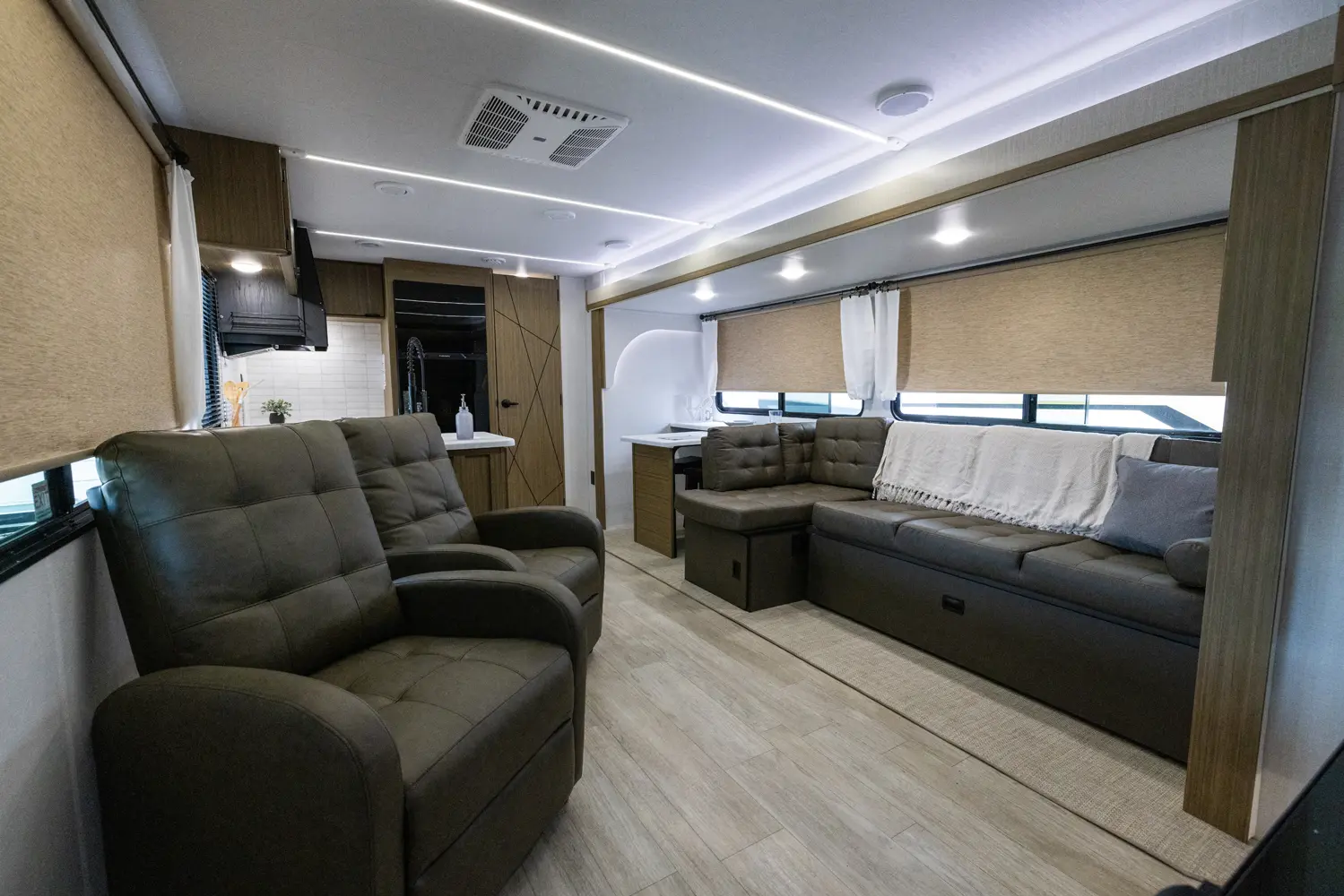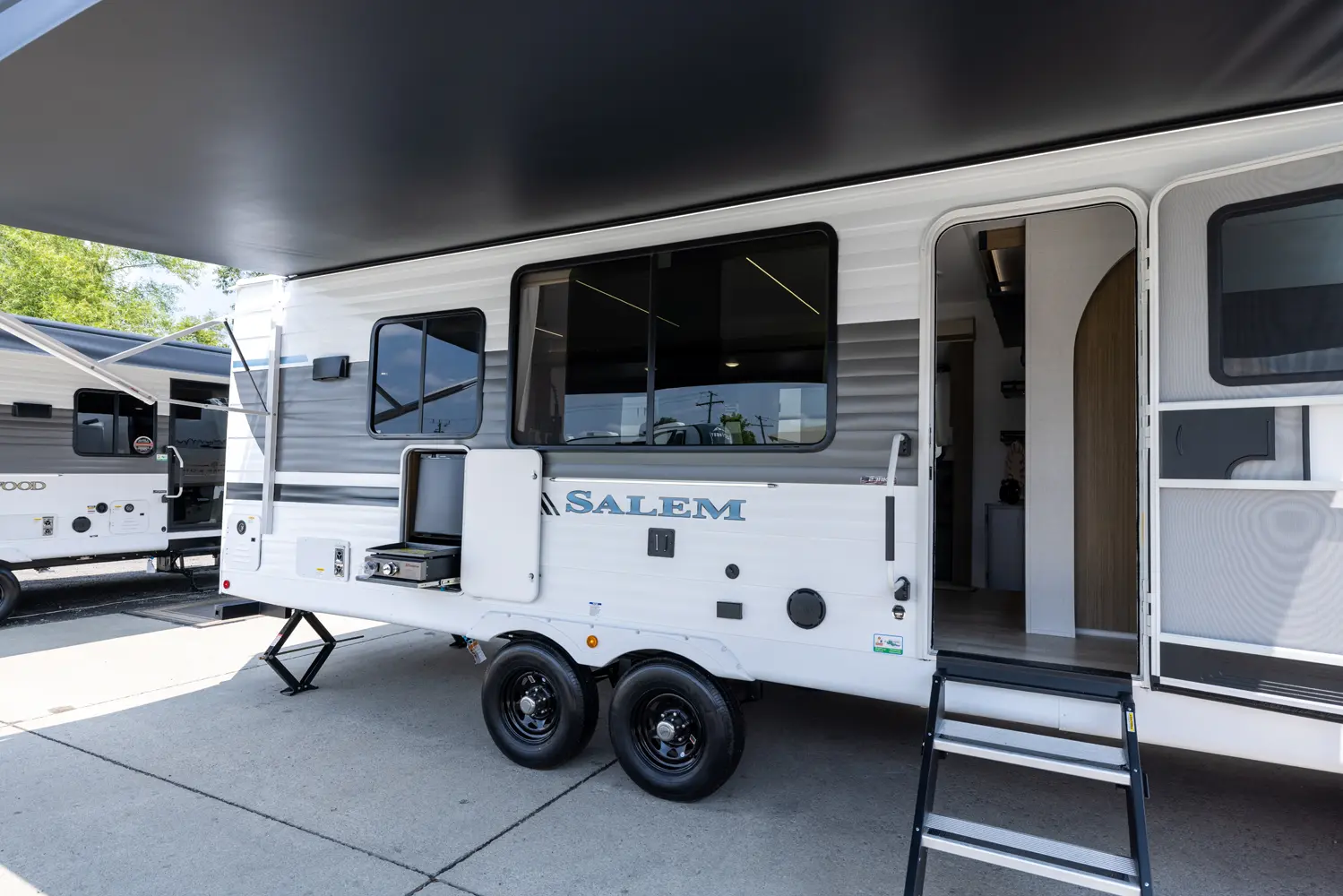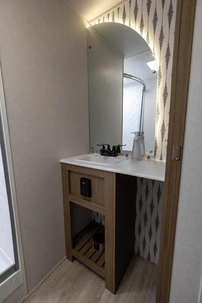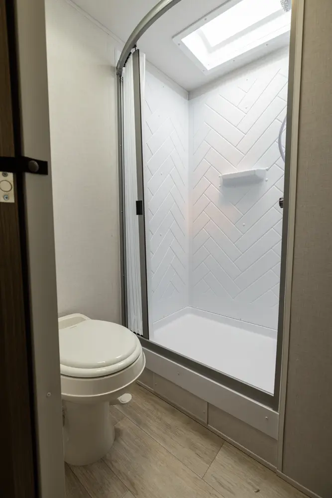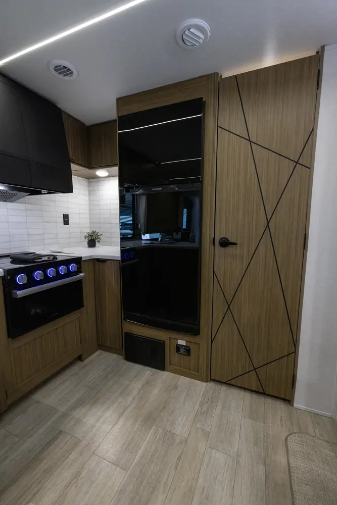 The 27RK stands out with its spacious kitchen and panoramic campsite windows. You will love the Versa-Lounge, which can reconfigure and customize according to your needs—and conveniently below is the Stow N Go Storage! This model also provides a fireplace (heater) and 11 CU. FT. refrigerator making you feel right at home.