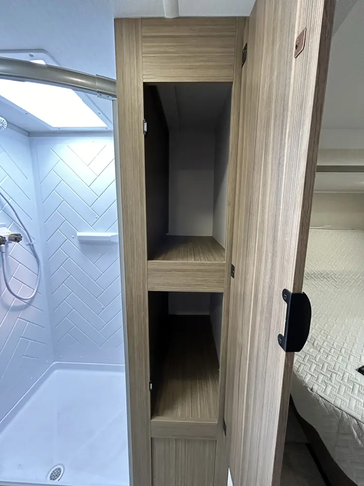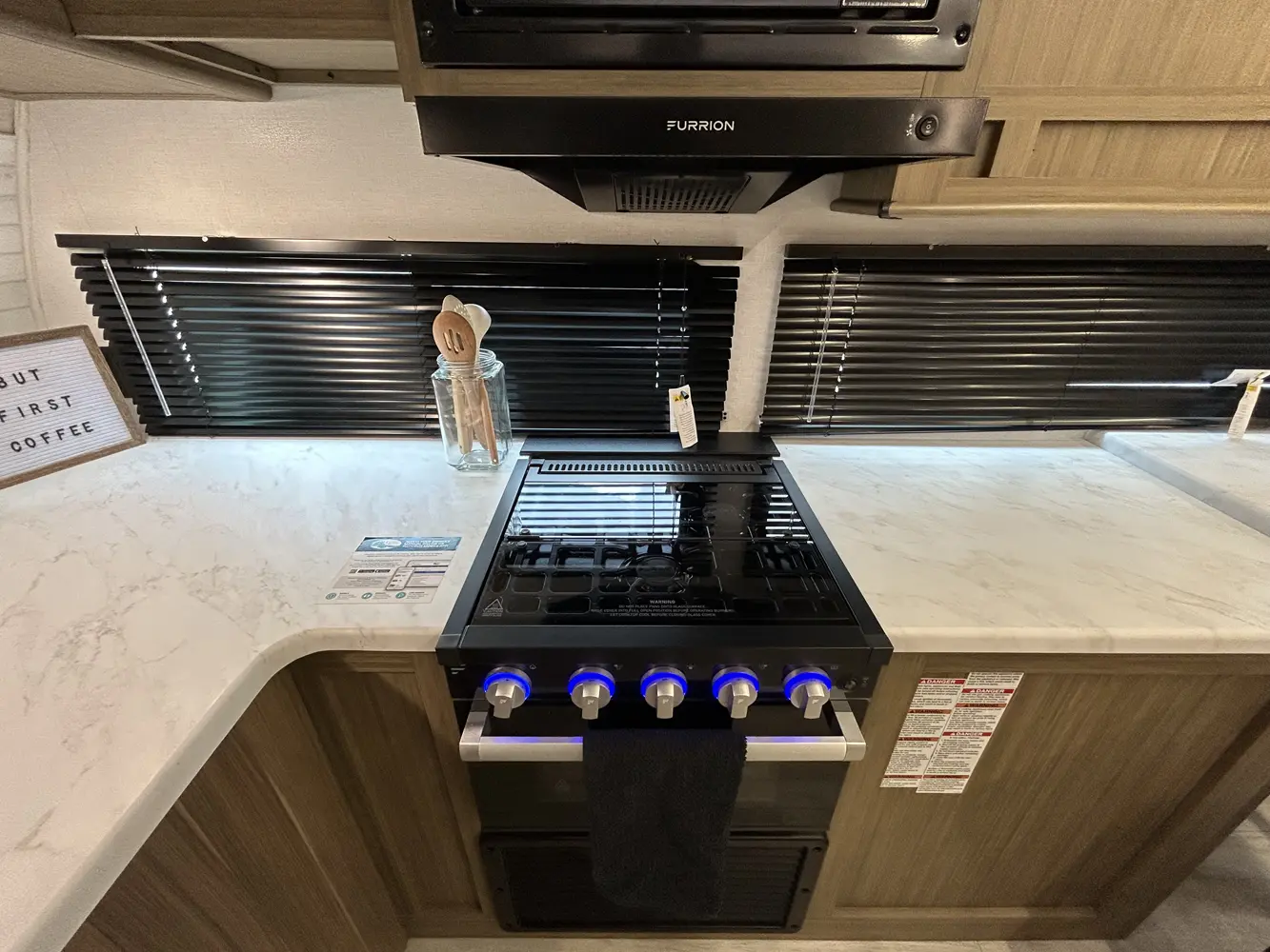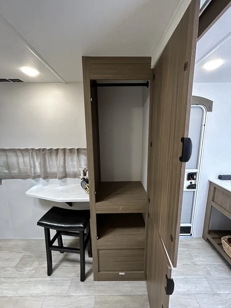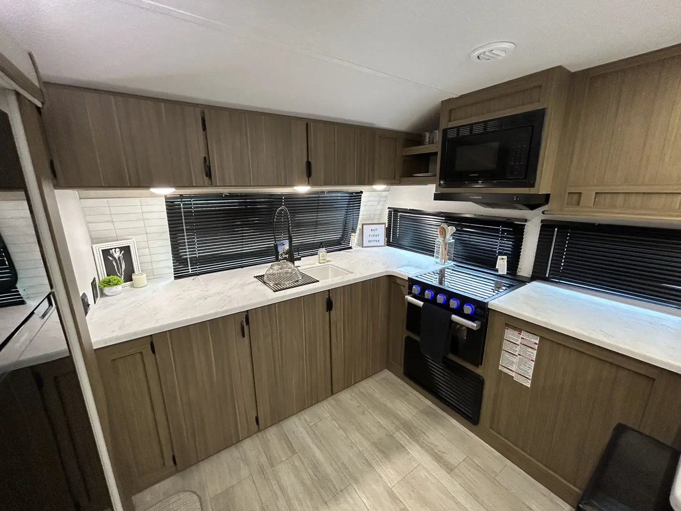 The Salem 28FKG floorplan has two entries and two slide outs. Exterior features include: fiberglass exterior, 20' awning and outside kitchen. Interiors features include: front kitchen and rear bathroom.