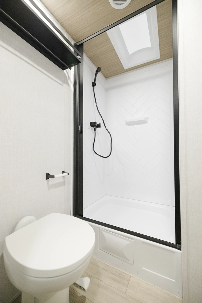 • Universal Docking Station Enclosed in Cargo Storage - Hookups Included: Cable & Satellite Switch, Fresh-Tank Gravity Fill, City Water, Black Tank Flush, Winterization Pump, Outdoor Shower, GFI Outlet, And Space Prepped for Solar Panel Controller