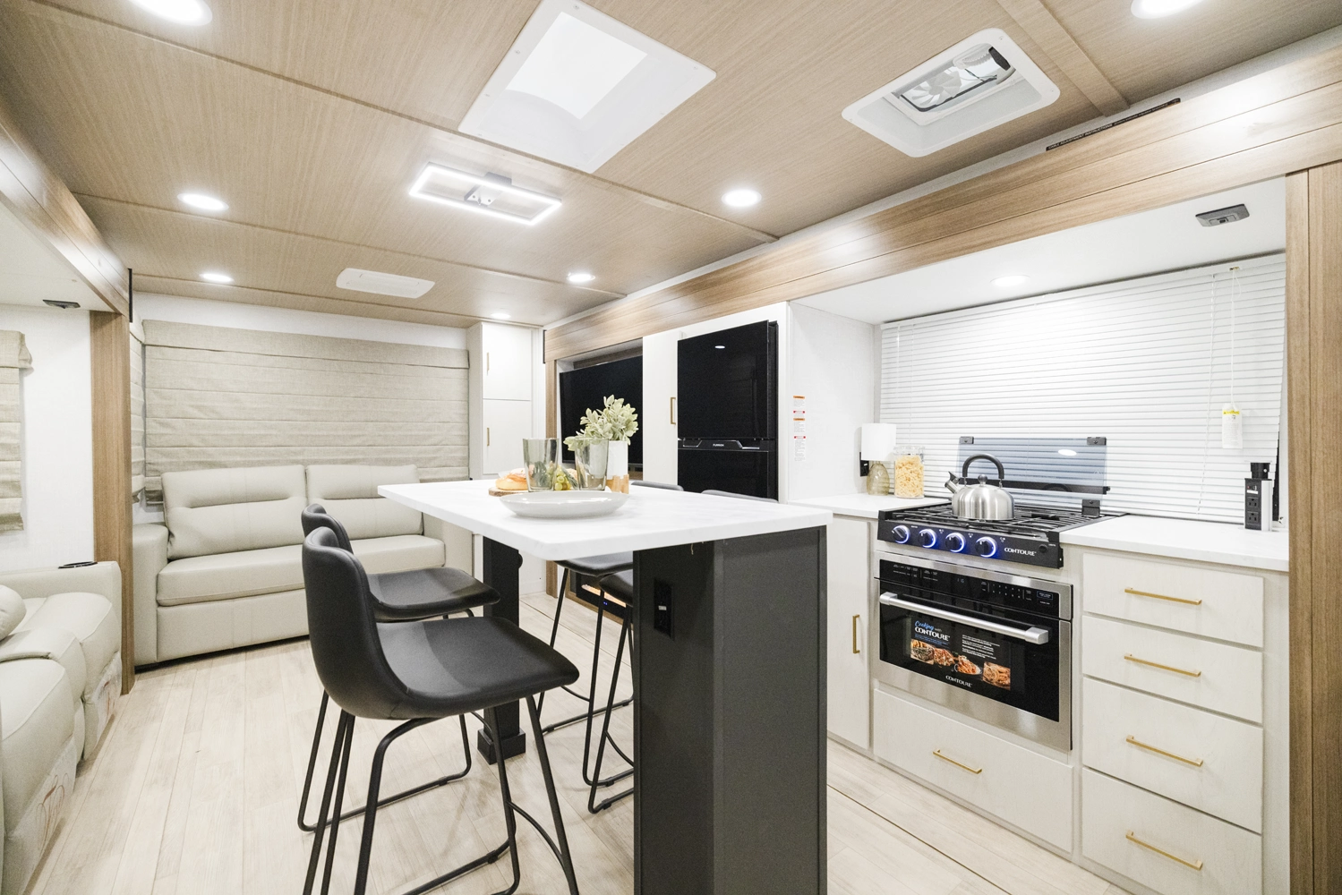 The 2800RL is our functional rear living floorplan that is sure to turn heads at the campsite. This travel trailer has dual opposing living slides that truly opens up the living space. With a large island countertop complete with four designer barstools, you get an abundance of features. With washer/dryer prep, king size bed, designated desk space, and an option for a 3rd A/C it seems too good to be true on a travel trailer.