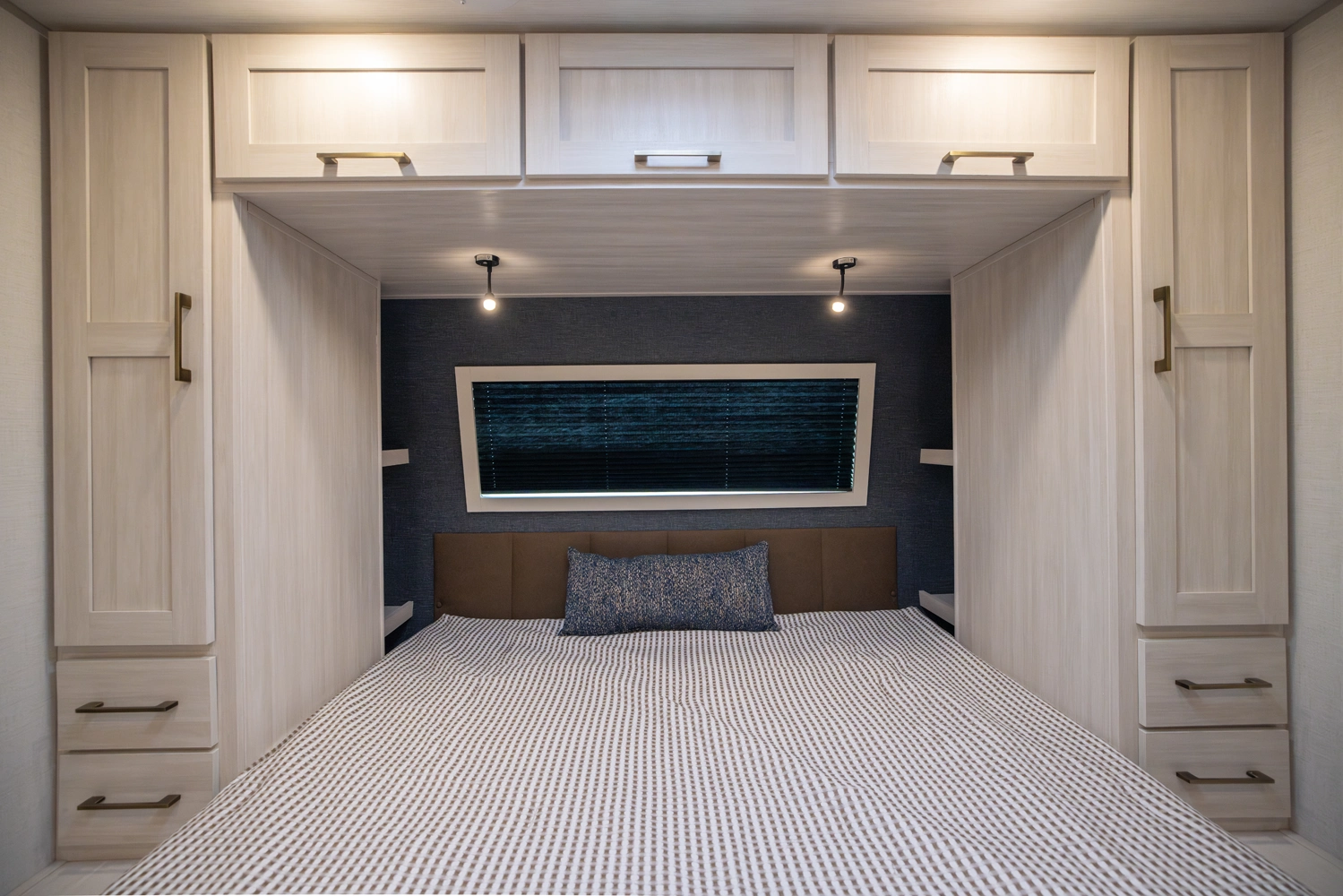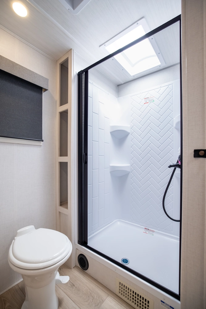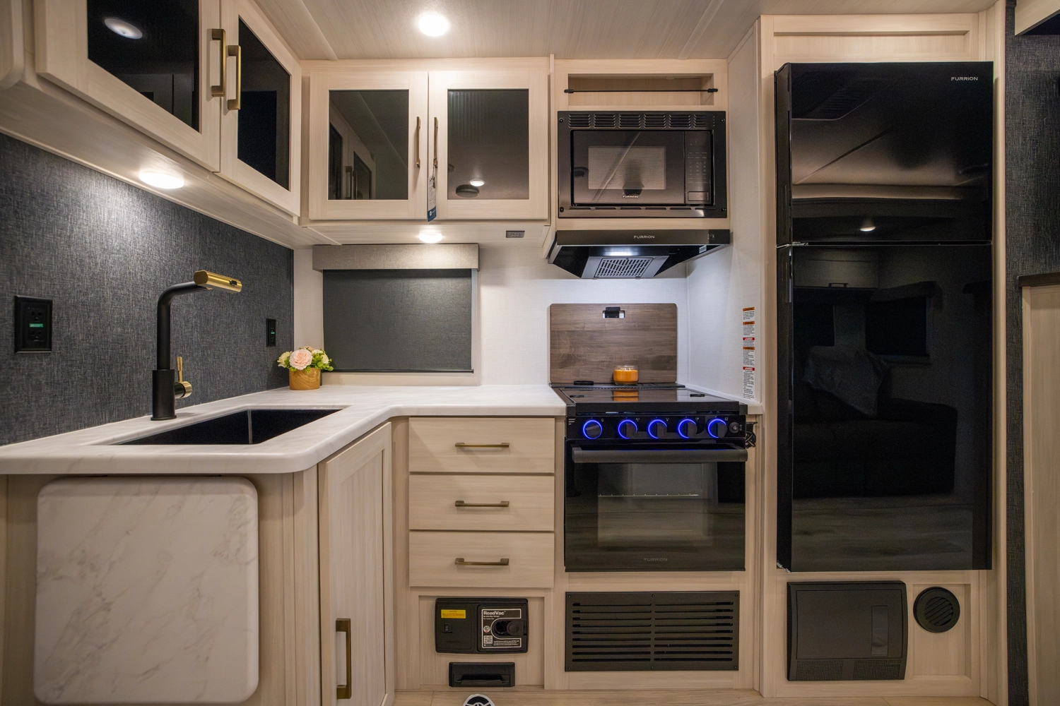 Sleeps 6. Tow vehicle 6800 lbs. minimum. No roughing it in this top selling model with walk in pantry, cook up a feast with sizable countertop space w/extension, and beautiful Barn Door concealing a big rear bathroom. Go down any road knowing you have the best in class nights rest coming in your master suite; “Cubbie” storage, large wardrobes, cavernous OH, drawers, USB’s, massive under bed storage. To top it off we added an outside kitchen!