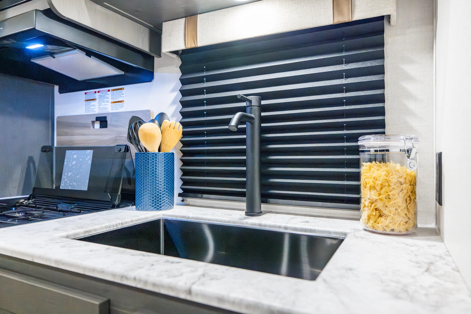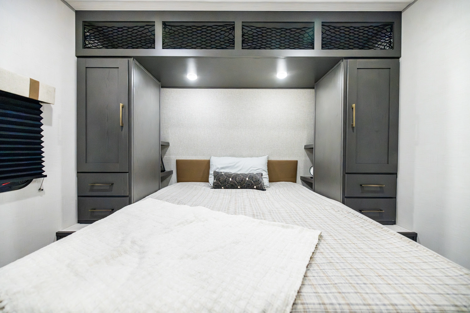 The Ibex New Trail Edition TRAIL28 features a front queen bed, central living area with sofa and dinette, a full kitchen, and a walk-through bath. A private rear bunk room offers four bunks and extra storage. Includes washer/dryer prep, tankless water heater, 50-amp service, and designed with superior construction.