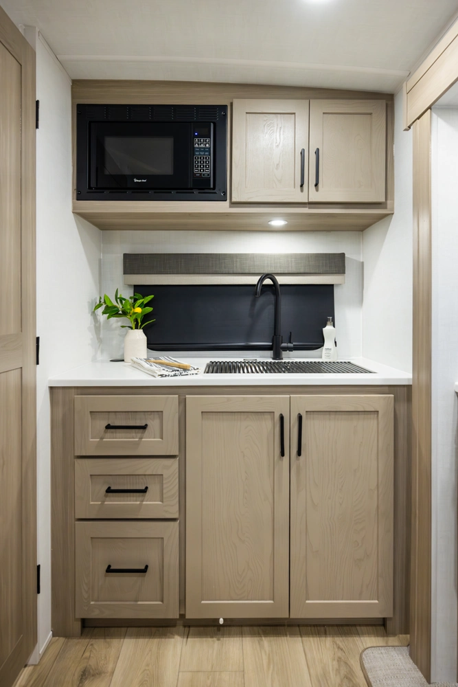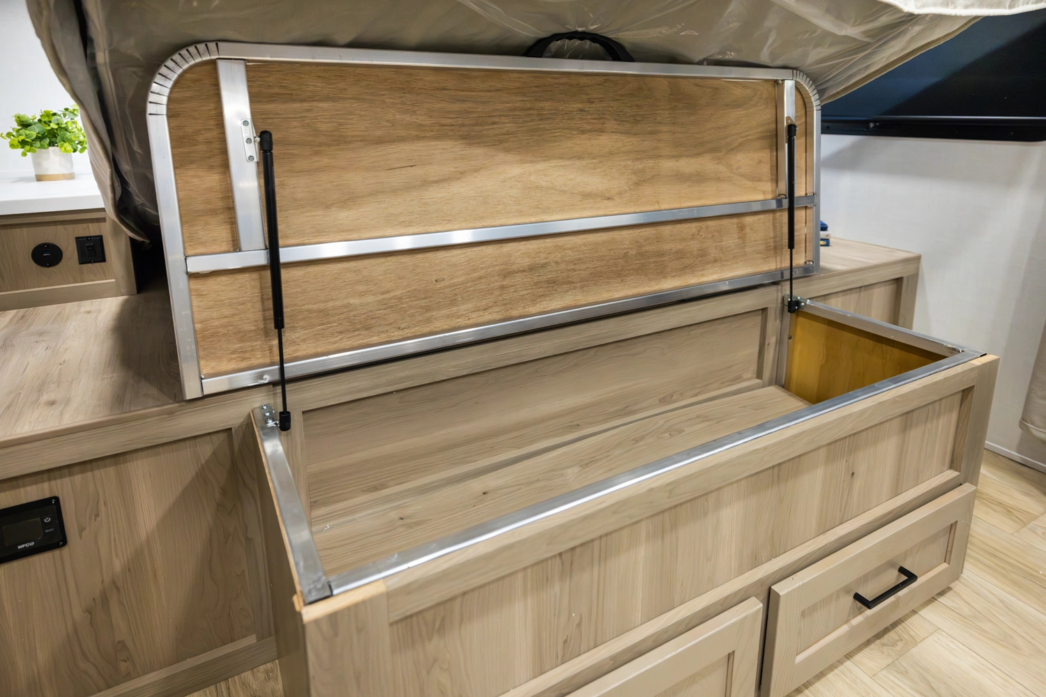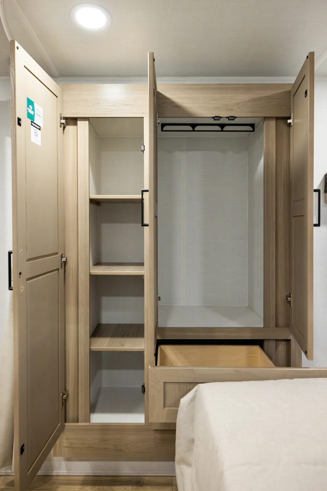 The 2522FB is a beautiful front bedroom floor plan featuring a unique wardrobe/pantry slideout for exceptional storage and organization. The living area includes theater seating directly across from the adjustable “televator” which raises for TV viewing and lowers so you can enjoy the massive door side window views. A versatile dinette and spacious rear kitchen with plenty of counter space completes the thoughtful design.