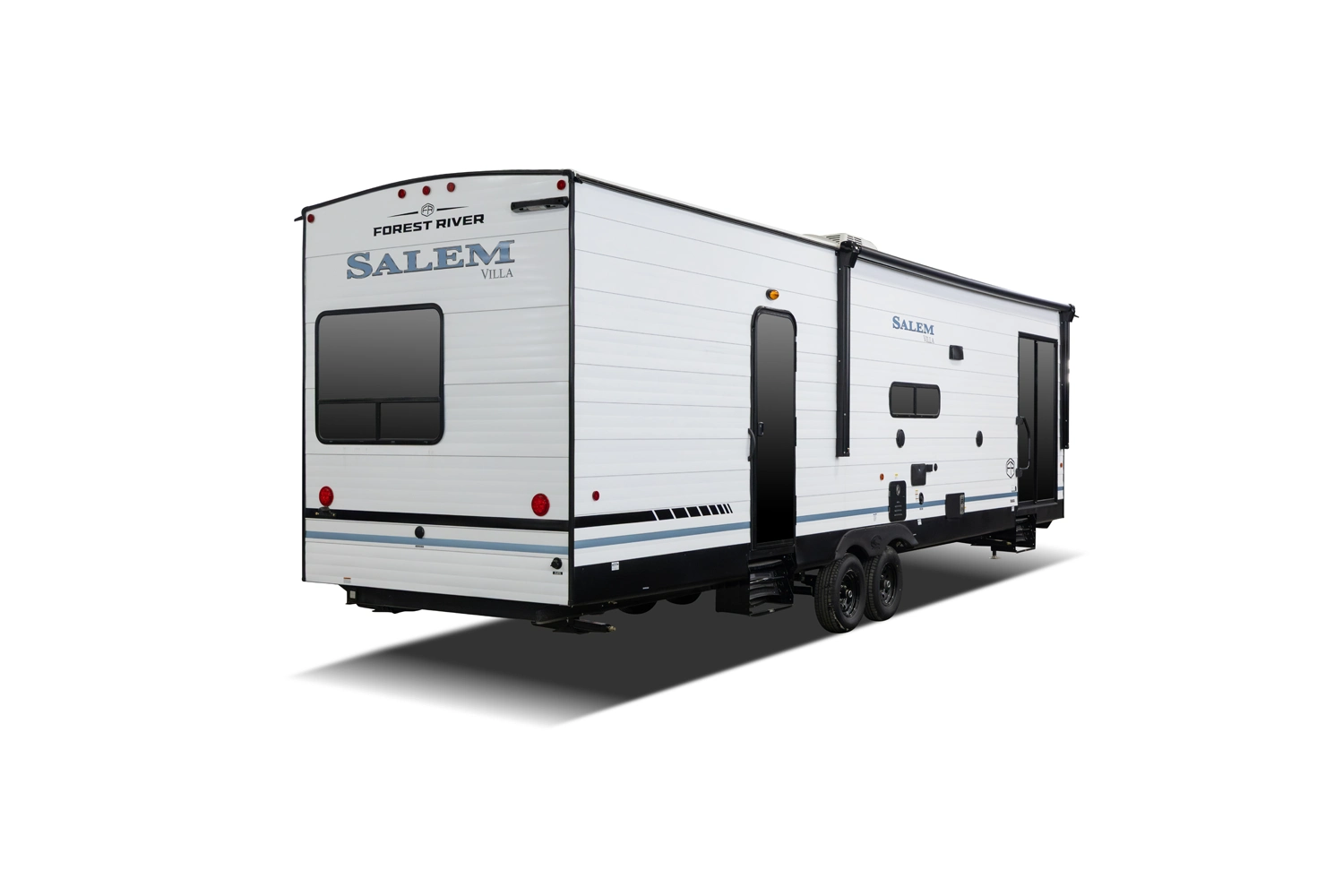 The Salem Villa 353FLB is the perfect destination trailer for making memories! The rear king bedroom provides plenty of space to stretch out, plus loads of storage space, while the adjacent bathroom gives you a linen closet and walk-in shower with a built-in seat. The large kitchen area includes a stove top plus oven, a residential refrigerator, and farmhouse sink. The living area has both theater seating and sofa with panoramic windows for great campsite views.