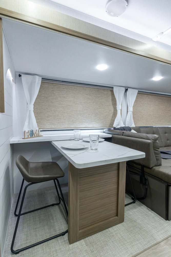 The 27RK stands out with its spacious kitchen and panoramic campsite windows. You will love the Versa-Lounge, which can reconfigure and customize according to your needs—and conveniently below is the Stow N Go Storage! This model also provides a fireplace (heater) and 11 CU. FT. refrigerator making you feel right at home.