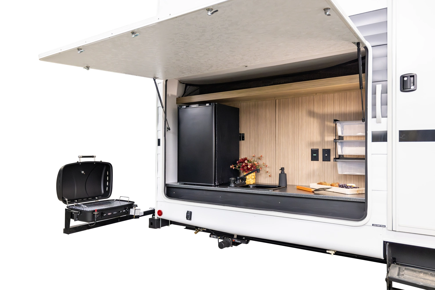 The 32BHDS is the ultimate bunkhouse, with two total slide outs and an outside kitchen. This well-equipped travel trailer features oversized panoramic windows, the ever-popular U-dinette, which you can customize with the adjacent Versa-Lounge. The kitchen includes a 11 CU. FT. refrigerator and stovetop with oven and LED accents, plus cabinets for all your cooking essentials!