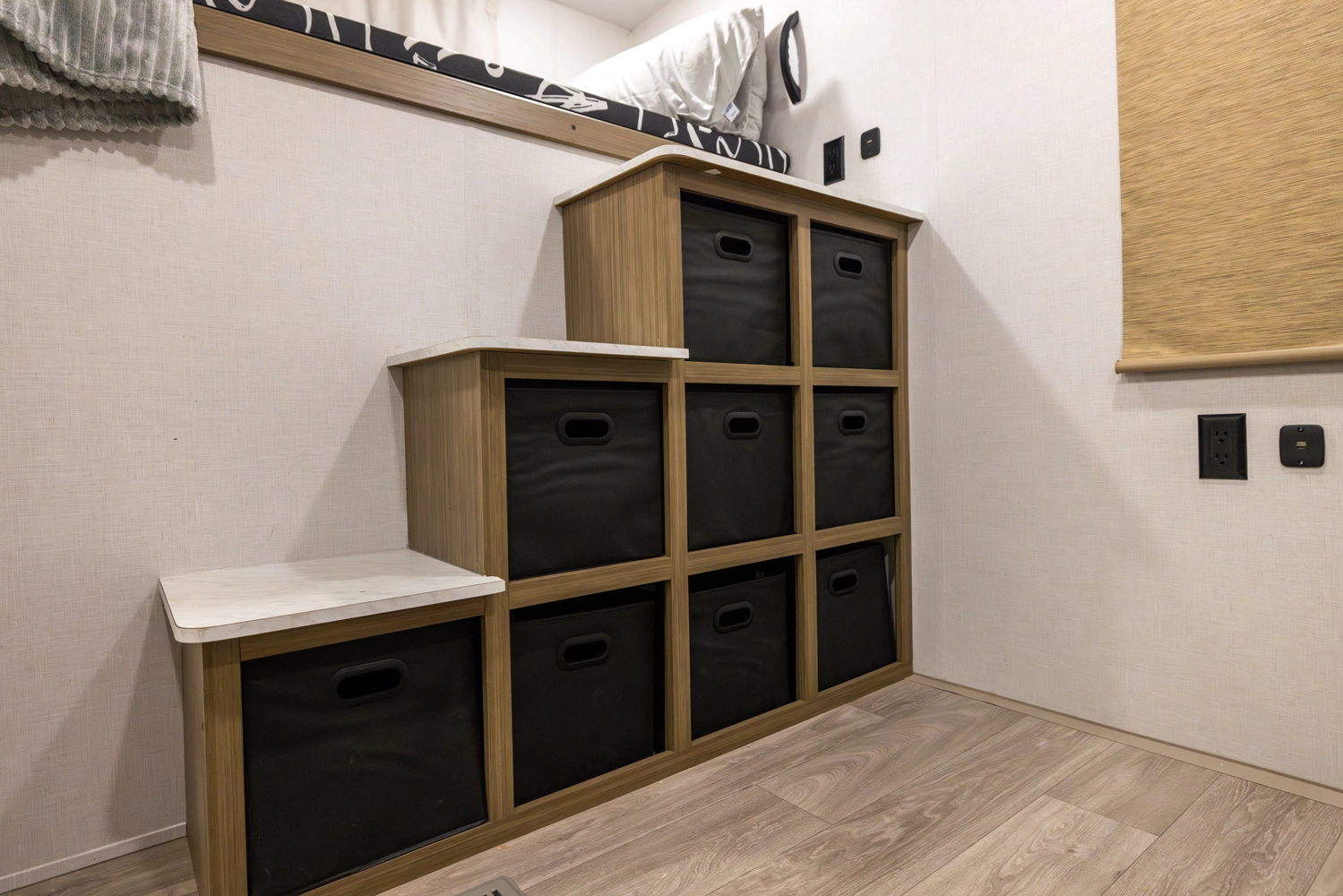 The 33TS is the ultimate bunkhouse, with three total slide outs and an outside kitchen. This well-equipped travel trailer features oversized panoramic windows and the desirable Versa-Lounge. The back-bunk room features the Versa-Queen giving this floorplan the option for two queen beds!