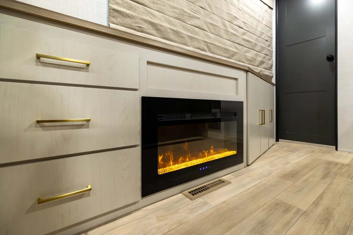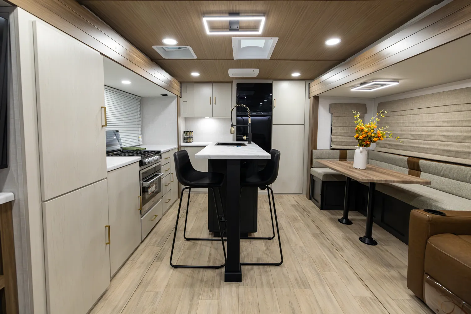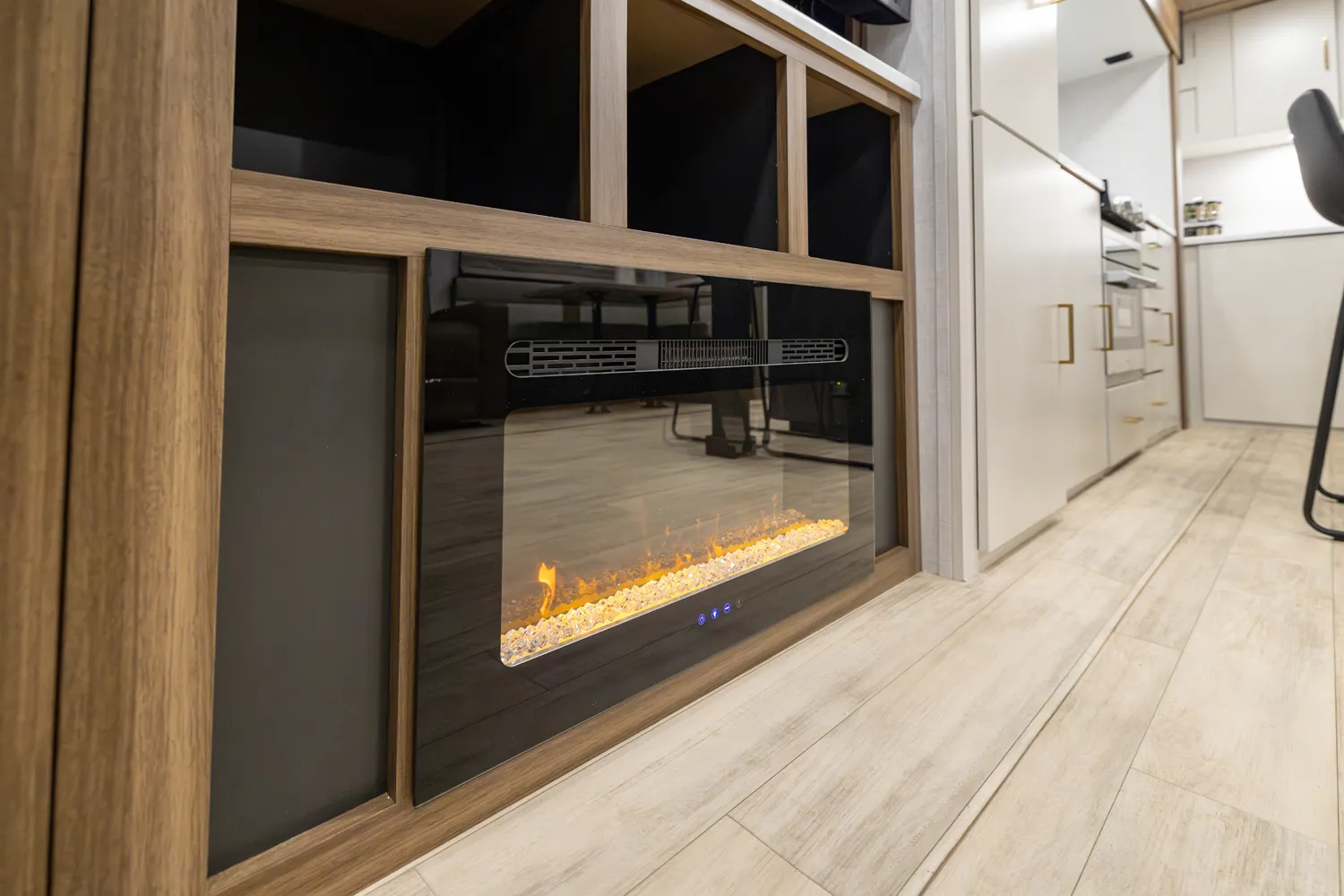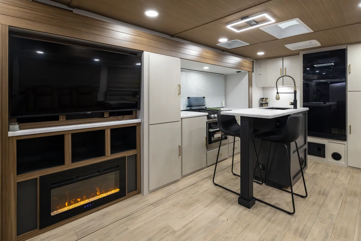 The 3400XL is a luxurious travel trailer perfect for couples or people looking for a large bedroom and plenty entertainment space. This coach features a wine fridge, extra electric fireplace, and a large reach-in closet in addition to your washer/dryer prep. This coach offers the most effective use of counter space and island space. Complete with a King Bed inside of your luxurious master bedroom suite. This travel trailer has everything you need for a fun-packed camping trip.
