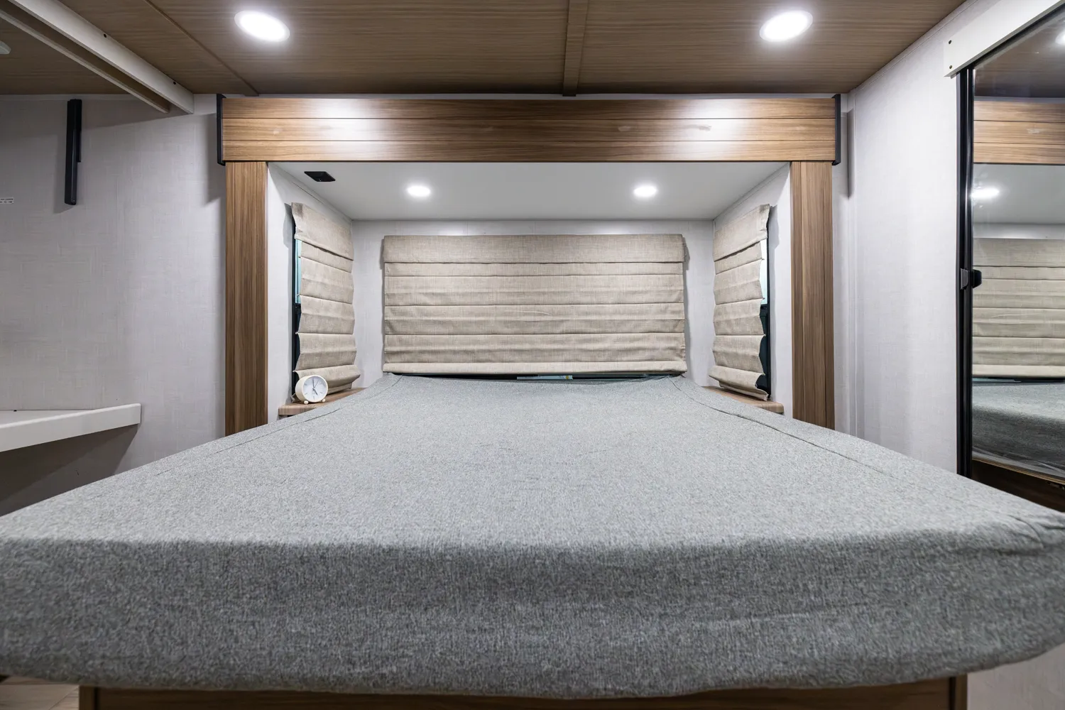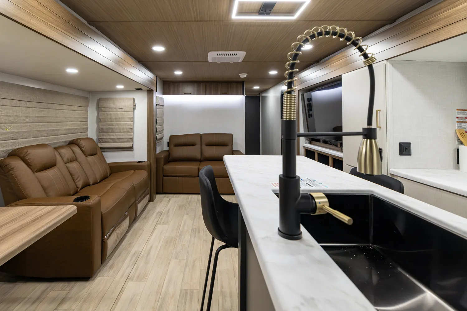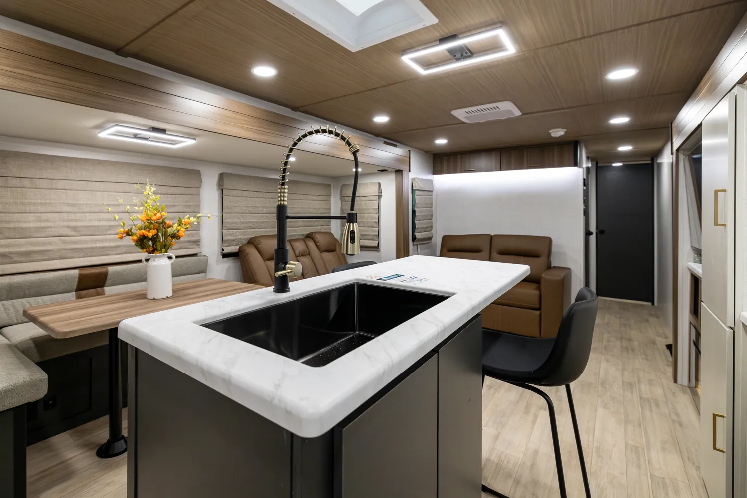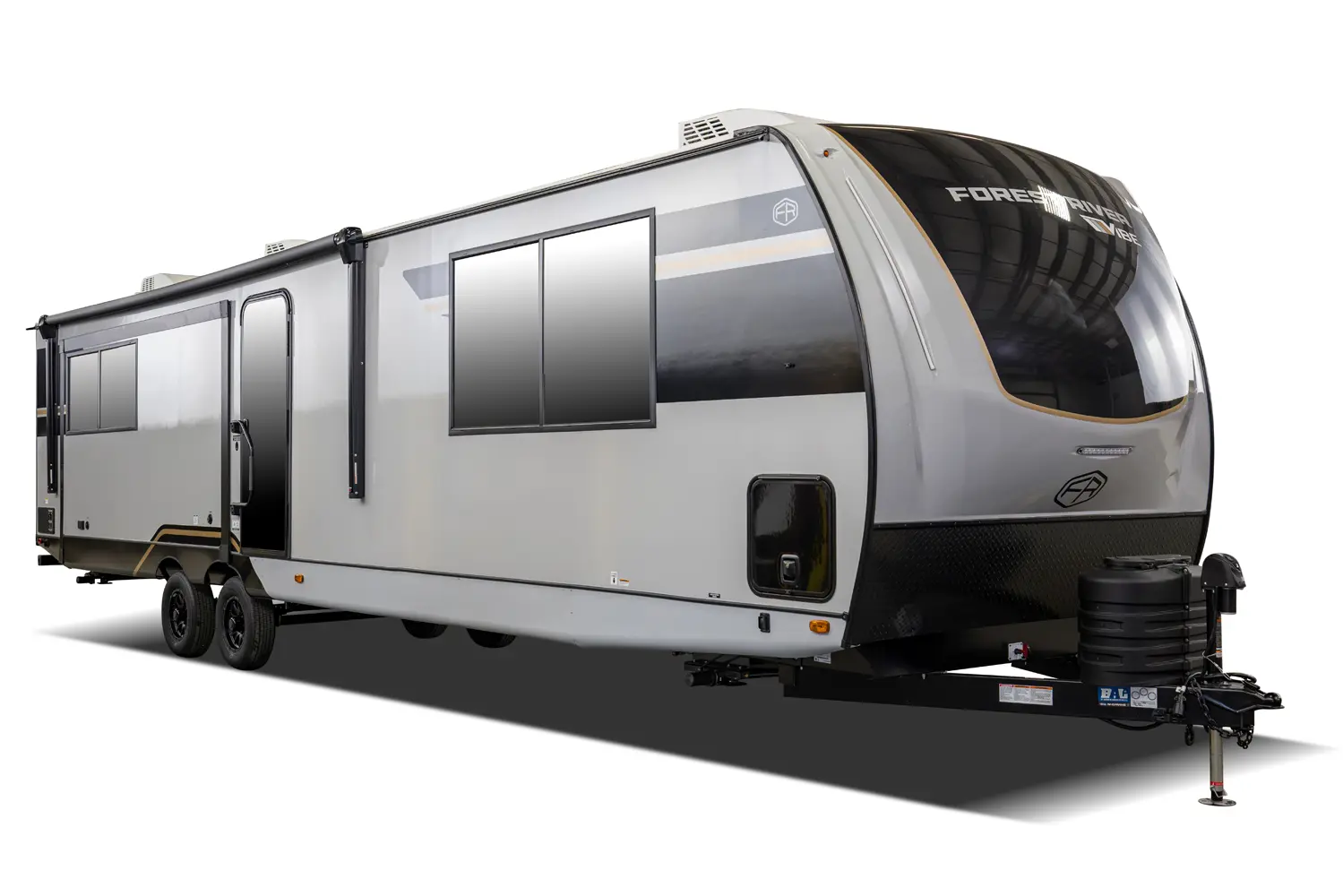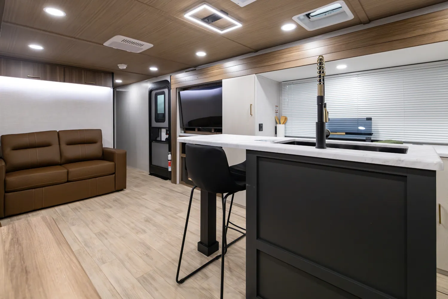 The 3400XL is a luxurious travel trailer perfect for couples or people looking for a large bedroom and plenty entertainment space. This coach features a wine fridge, extra electric fireplace, and a large reach-in closet in addition to your washer/dryer prep. This coach offers the most effective use of counter space and island space. Complete with a King Bed inside of your luxurious master bedroom suite. This travel trailer has everything you need for a fun-packed camping trip.
