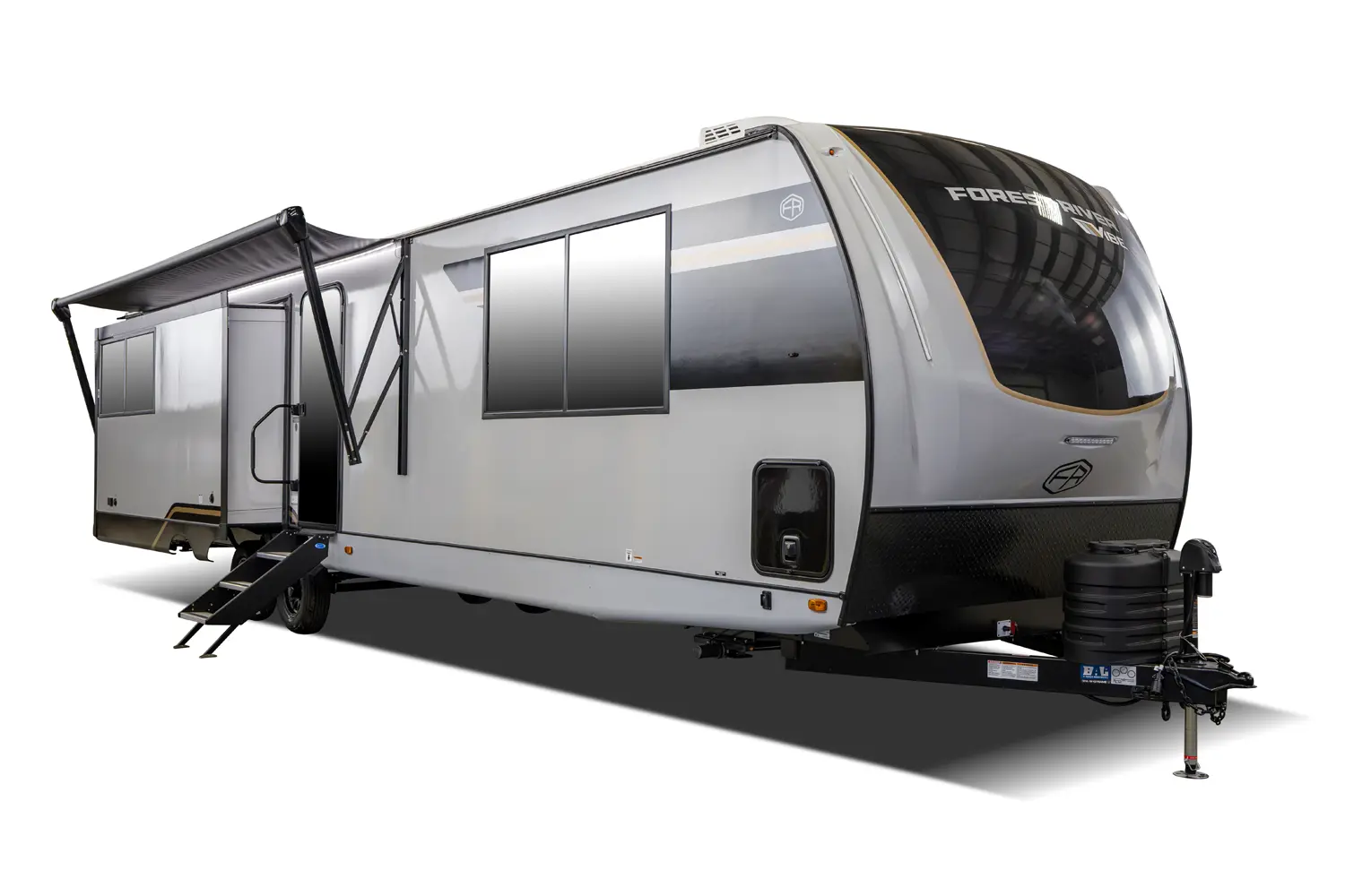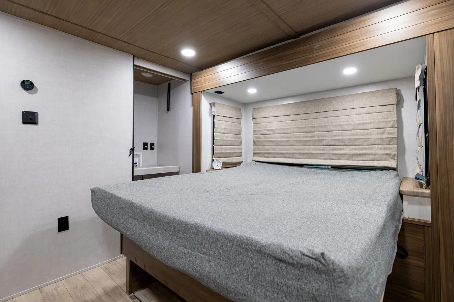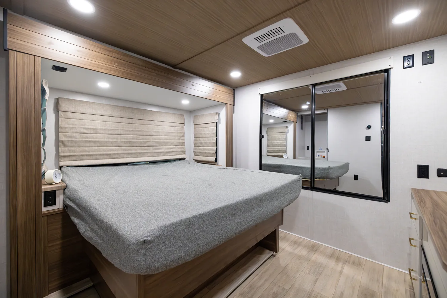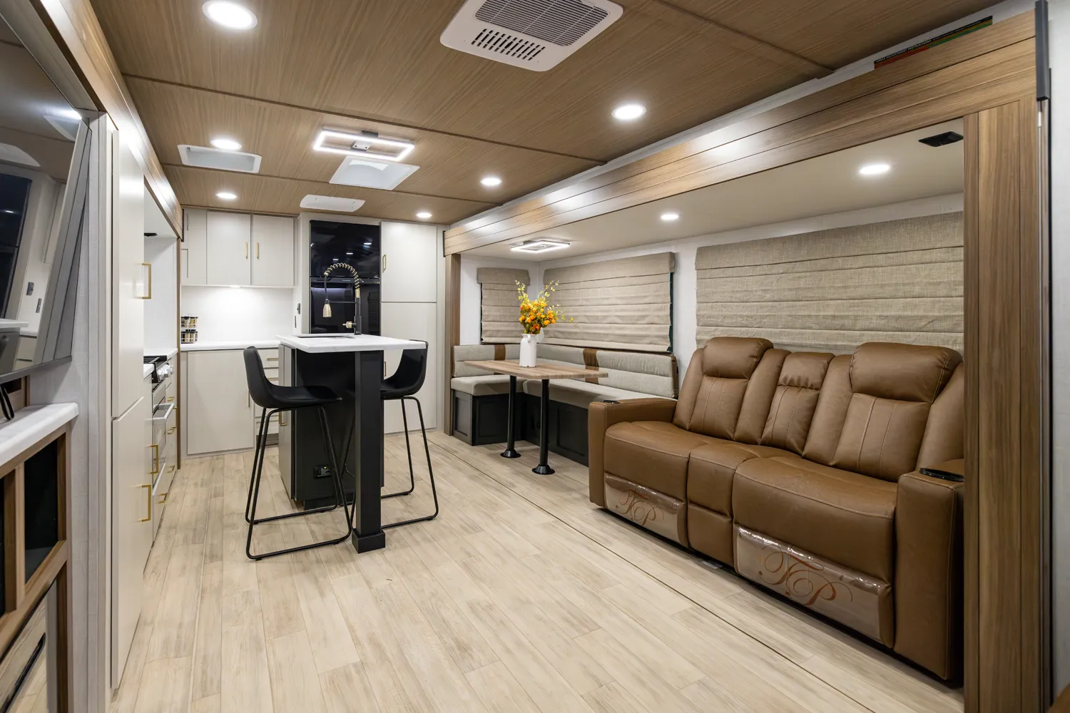 The 3400XL is a luxurious travel trailer perfect for couples or people looking for a large bedroom and plenty entertainment space. This coach features a wine fridge, extra electric fireplace, and a large reach-in closet in addition to your washer/dryer prep. This coach offers the most effective use of counter space and island space. Complete with a King Bed inside of your luxurious master bedroom suite. This travel trailer has everything you need for a fun-packed camping trip.