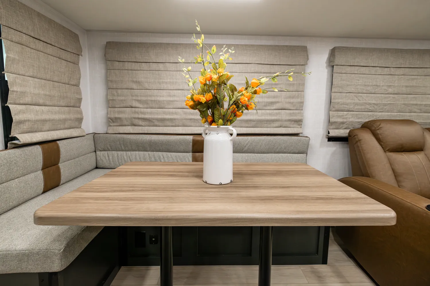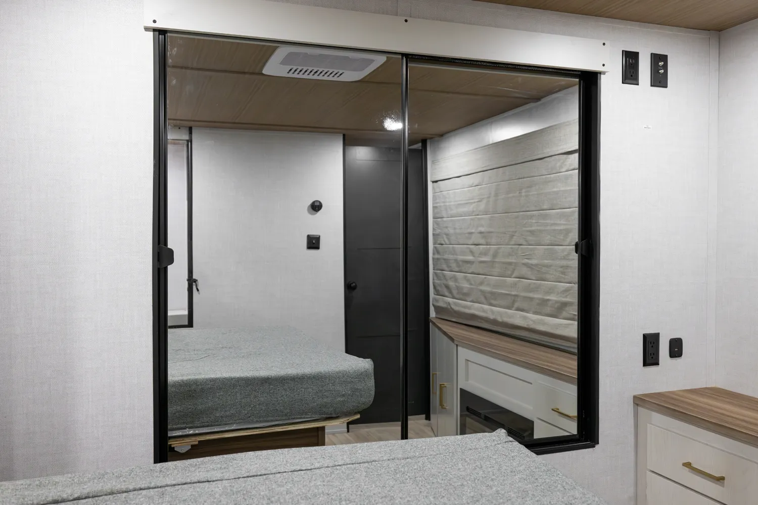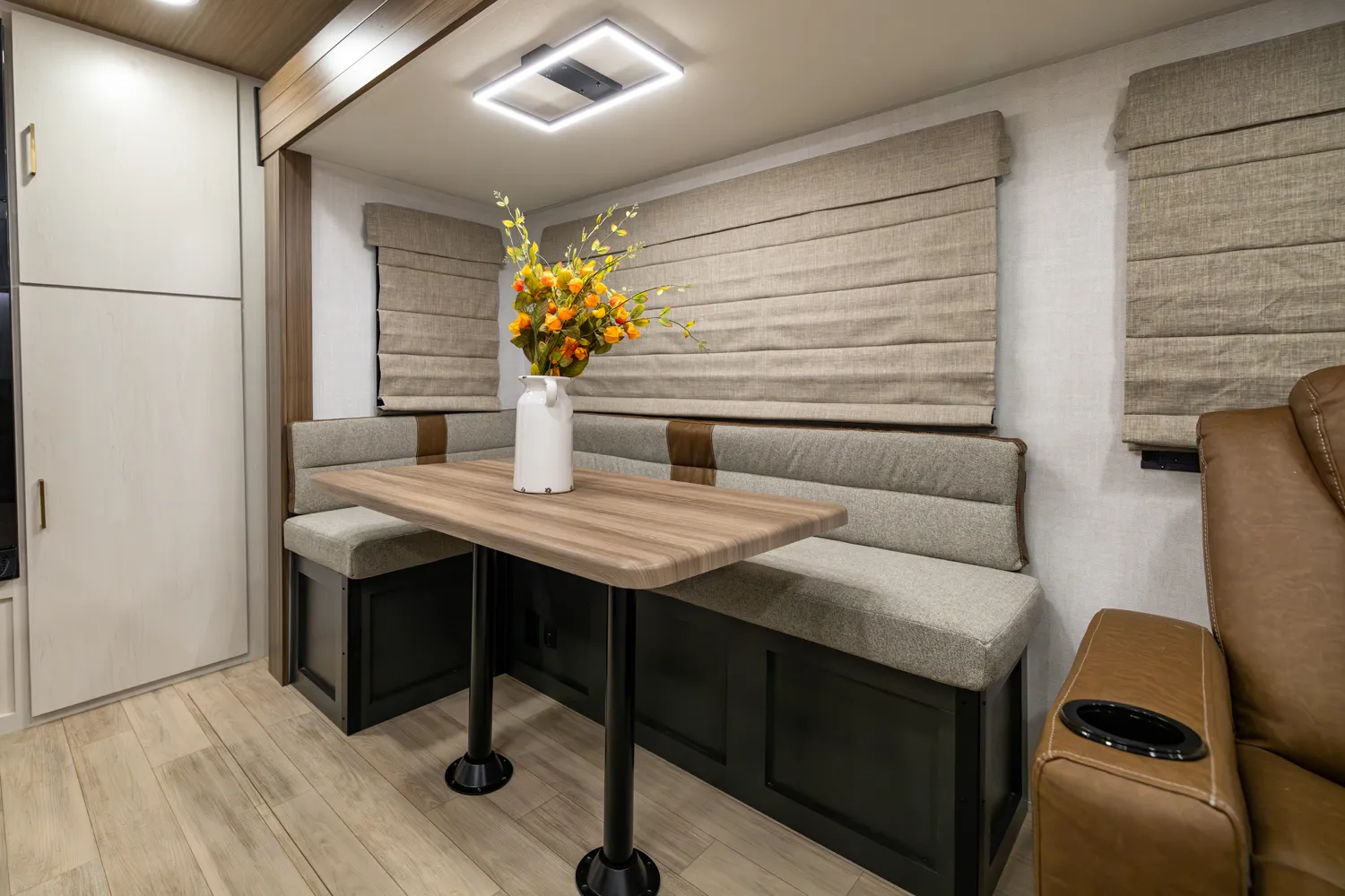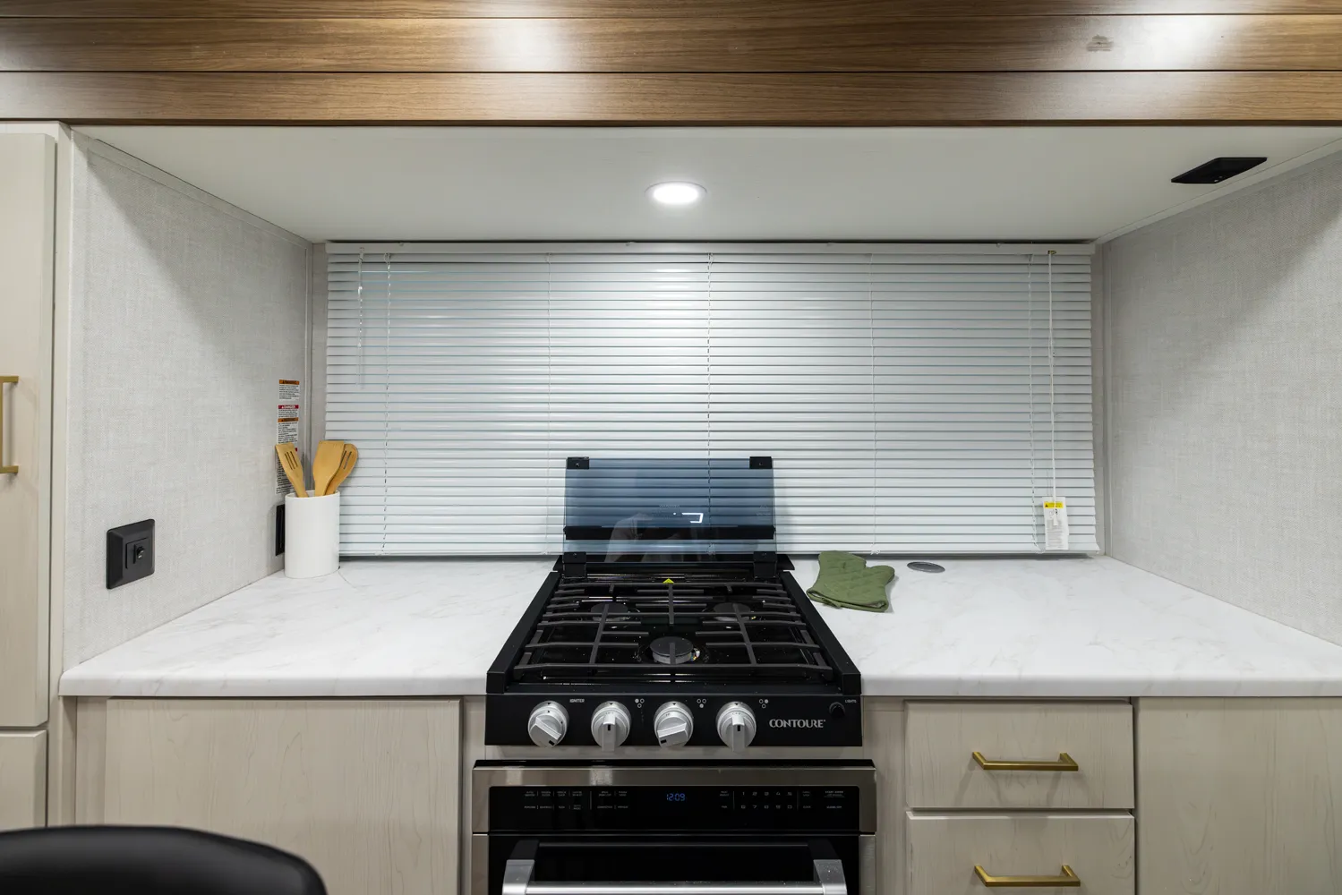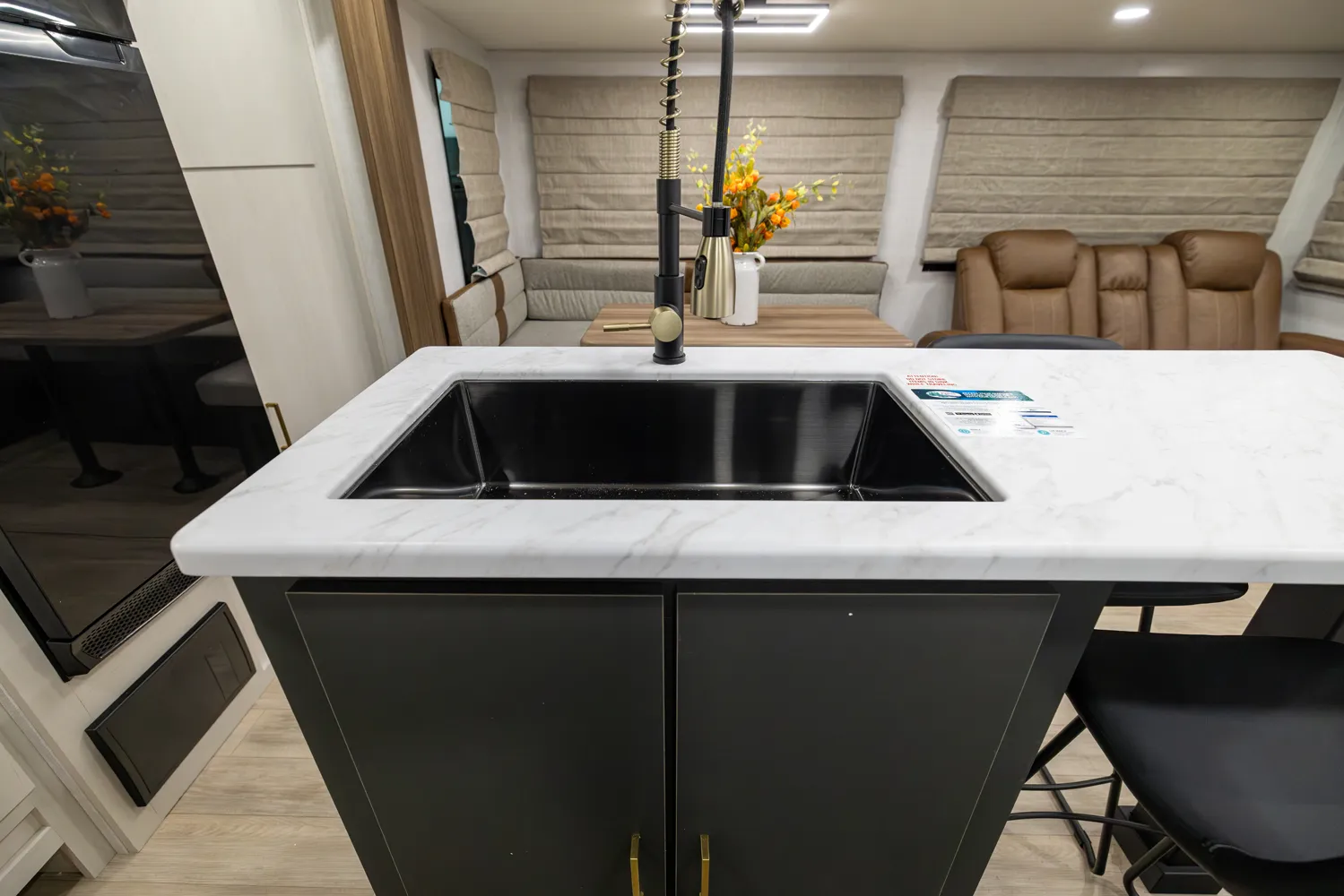 The 3400XL is a luxurious travel trailer perfect for couples or people looking for a large bedroom and plenty entertainment space. This coach features a wine fridge, extra electric fireplace, and a large reach-in closet in addition to your washer/dryer prep. This coach offers the most effective use of counter space and island space. Complete with a King Bed inside of your luxurious master bedroom suite. This travel trailer has everything you need for a fun-packed camping trip.