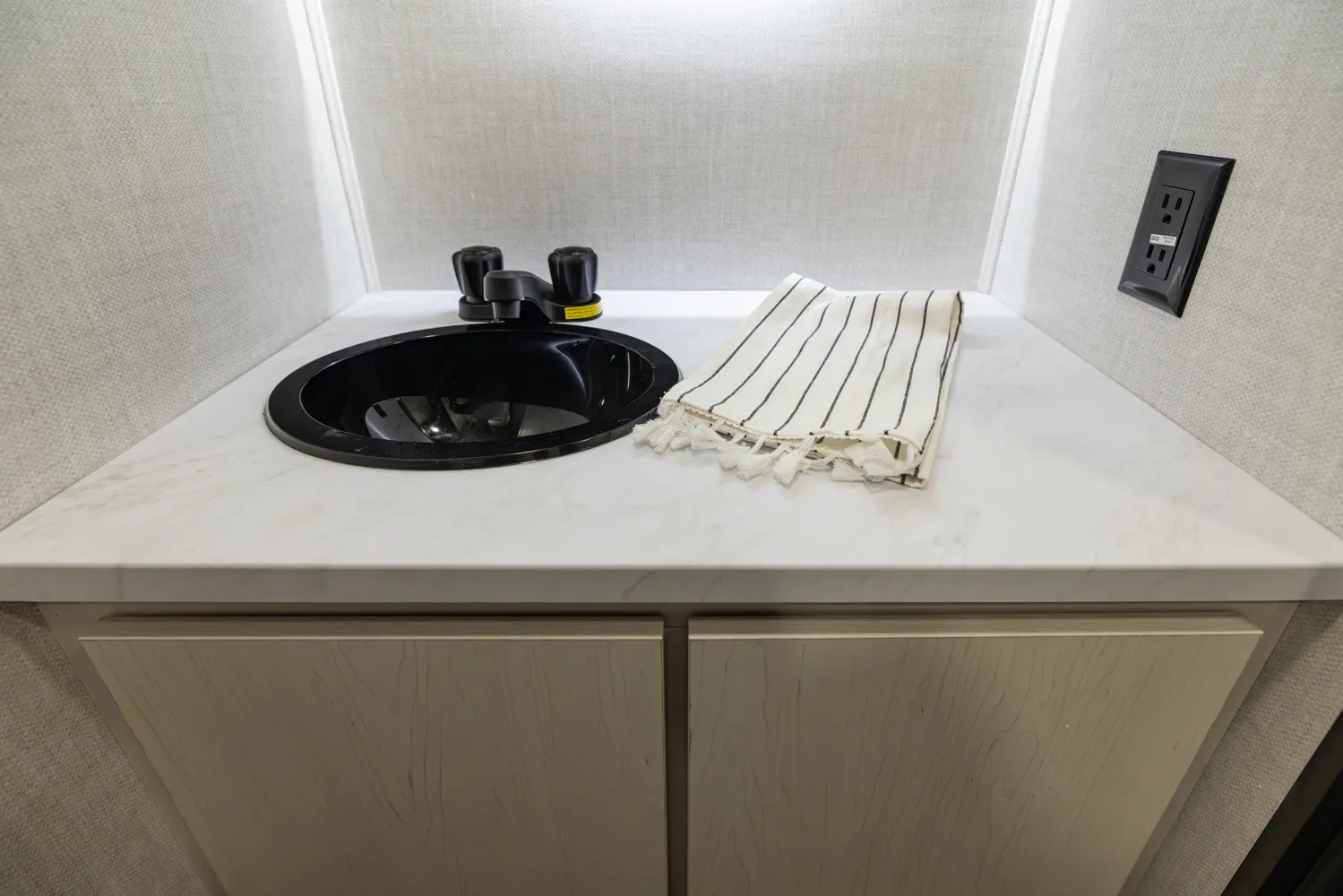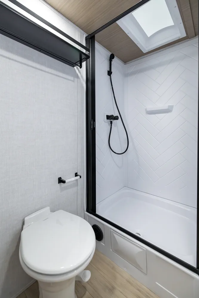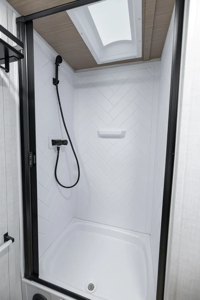 • Universal Docking Station Enclosed in Cargo Storage - Hookups Included: Cable & Satellite Switch, Fresh-Tank Gravity Fill, City Water, Black Tank Flush, Winterization Pump, Outdoor Shower, GFI Outlet, And Space Prepped for Solar Panel Controller
